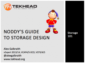 As it happens, at this VMUG I will be presenting my own session, Noddy’s Guide to Storage Design – Storage 101, where I go through the basics of storage design decisions and impacts along with a few tips I’ve picked up over the years. I plan to potentially follow this up by turning it into a series of blog posts. At time of writing I have over 40 slides in my deck and that’s just the basics. My biggest issue is probably not lack of content, so I need to work on cutting it down before Thursday for sure!